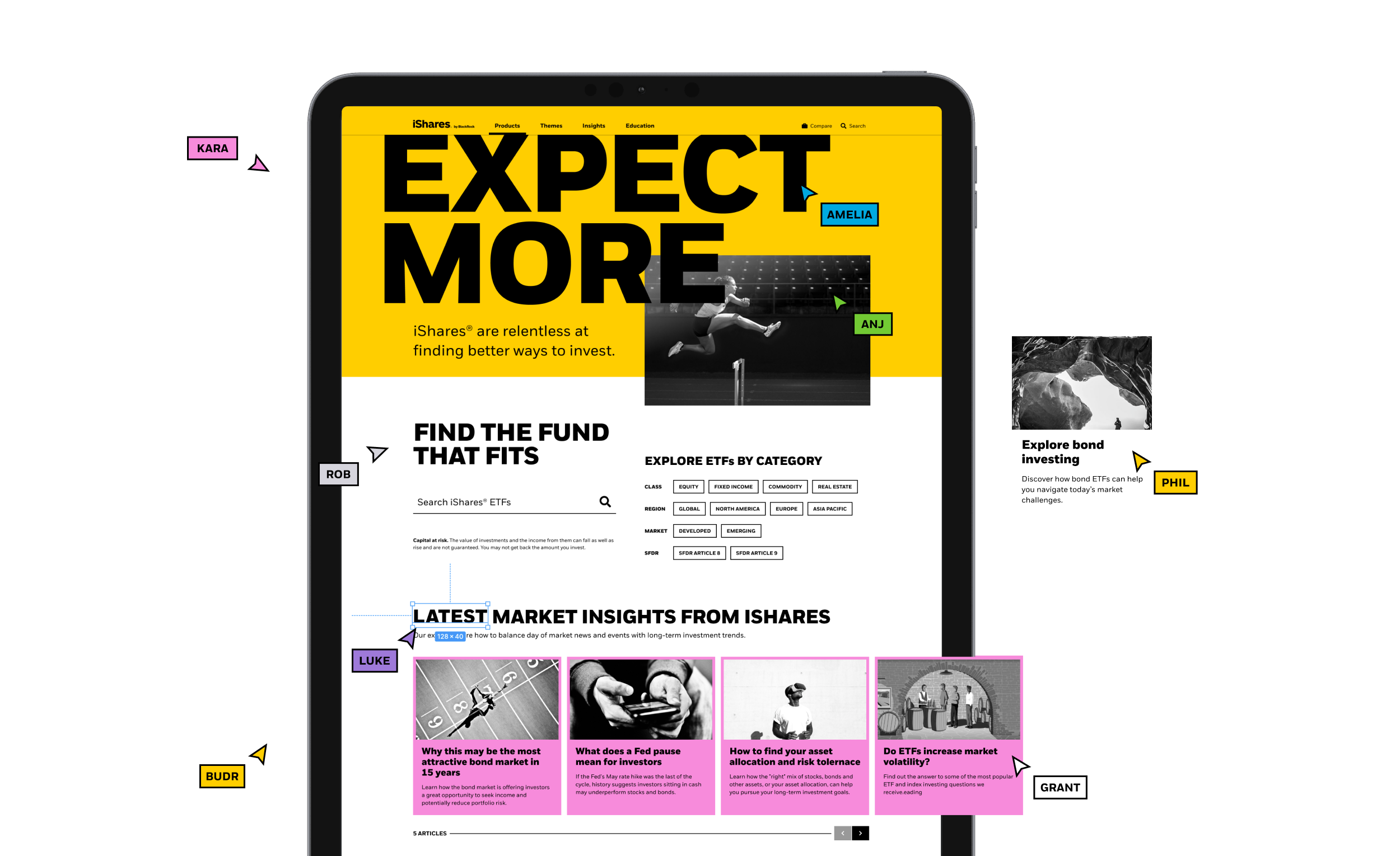 As the world’s largest ETF provider, iShares operates across multiple markets, audiences and internal stakeholders. The challenge was to translate a bold new identity into a coherent digital system that could support fund comparison tools, content storytelling and regional requirements - without fragmenting.